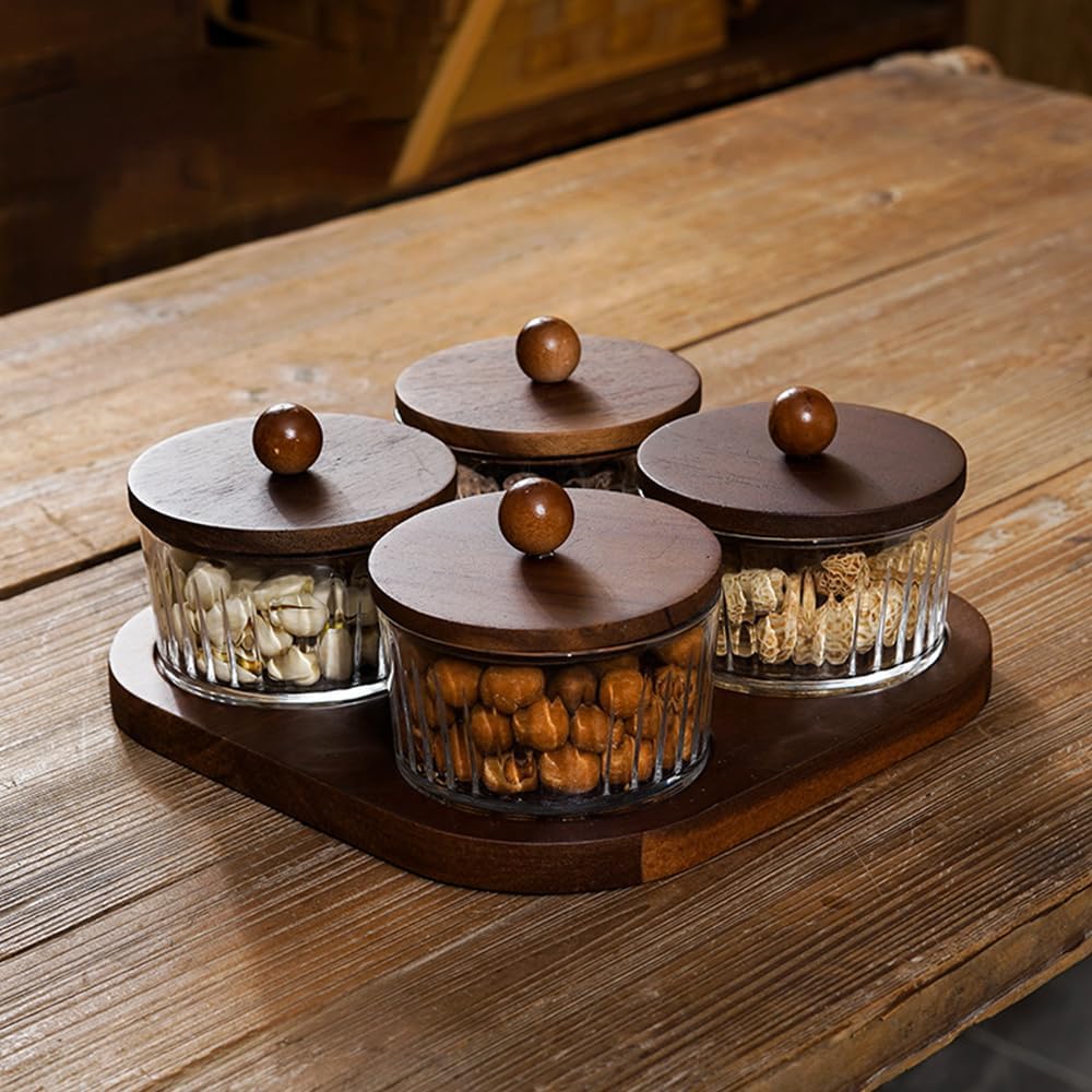 3/4/6 Compartments Glass Snack Box with Acacia Tray and Lid - Solid Wood Serving Platter for Nuts Candy Dry Fruits Storage Container Multi Purpose Party Food Organizer