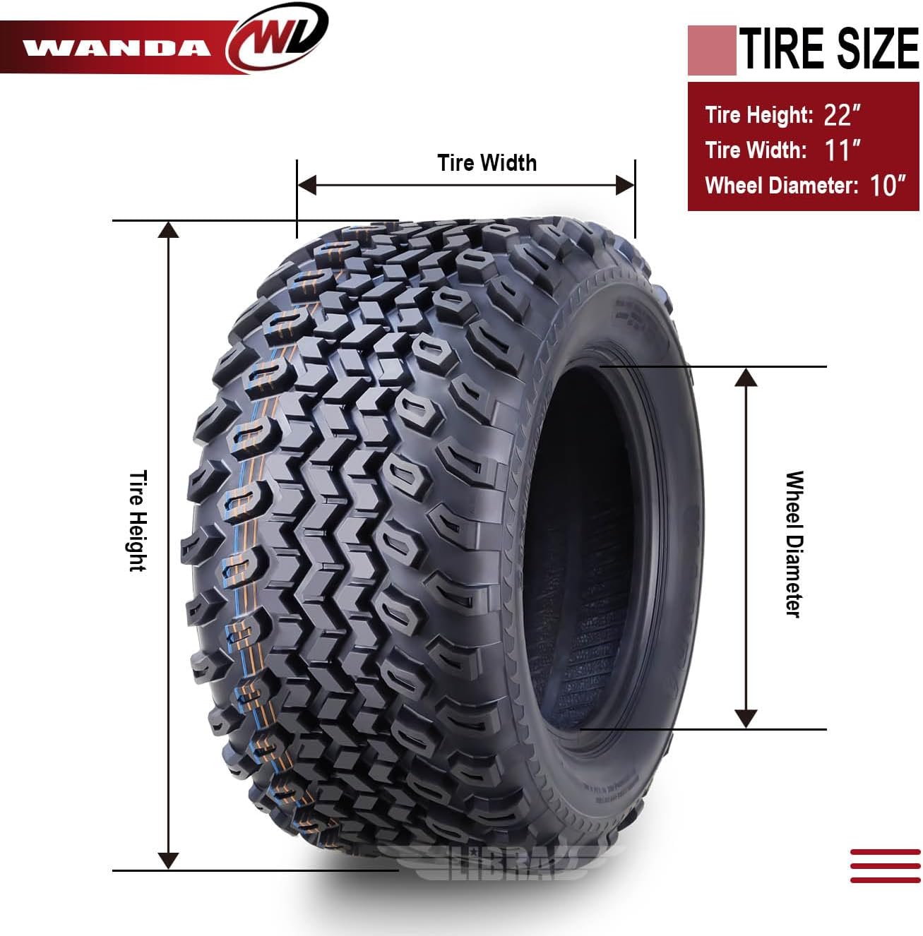 Full set (2 front+2 rear) for complete replacement,fits for a variety of ATV / UTV applications. HEAVY DUTY 1000lbs/tire capacity great for utility working ATV & golf carts. With exceptional ride stability combined with great all terrain traction. The Python's proven tread design has low rolling resistance turning horsepower into forward motion. Heavy 4 ply rated construction resists punctures and abrasions. Tires only, rims are not includedTire SpecificationsTire Size: 22X11-10Brand: WANDATread Pattern: P334Ply Rated: 4Tread Depth: 0.63Rim Width: 8.5Max Load: 1000lbs@20psiLoad Index: 80Speed Rating: BPlease note: fitment guide is for reference only and does not guarantee the tire will fit your specific model. Please check your owner's manual to ensure proper fitment.